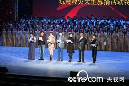 央视知名主持人周涛、朱军、董卿、张泽群将作主持、采访人;白岩松、李瑞英作新闻连线人;李咏、毕福剑、马东、朱迅、任鲁豫、崔永元、王小丫、撒贝宁、鞠萍、韩乔生、董浩、欧阳夏丹、李梓萌、胡蝶、鲁健等50人担任现场捐助热线电话接线员。