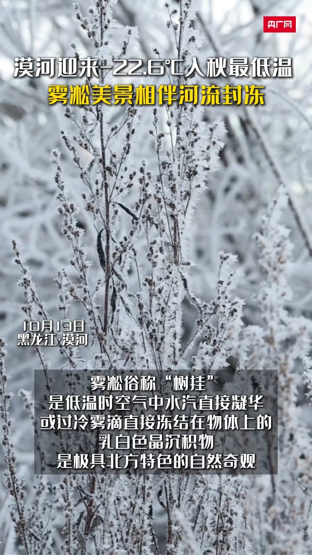 10月13日早晨漠河境内最低气温达到-22.6℃,迎来入秋最低温,江河进入冰封时节,雾凇美景也如约而至。