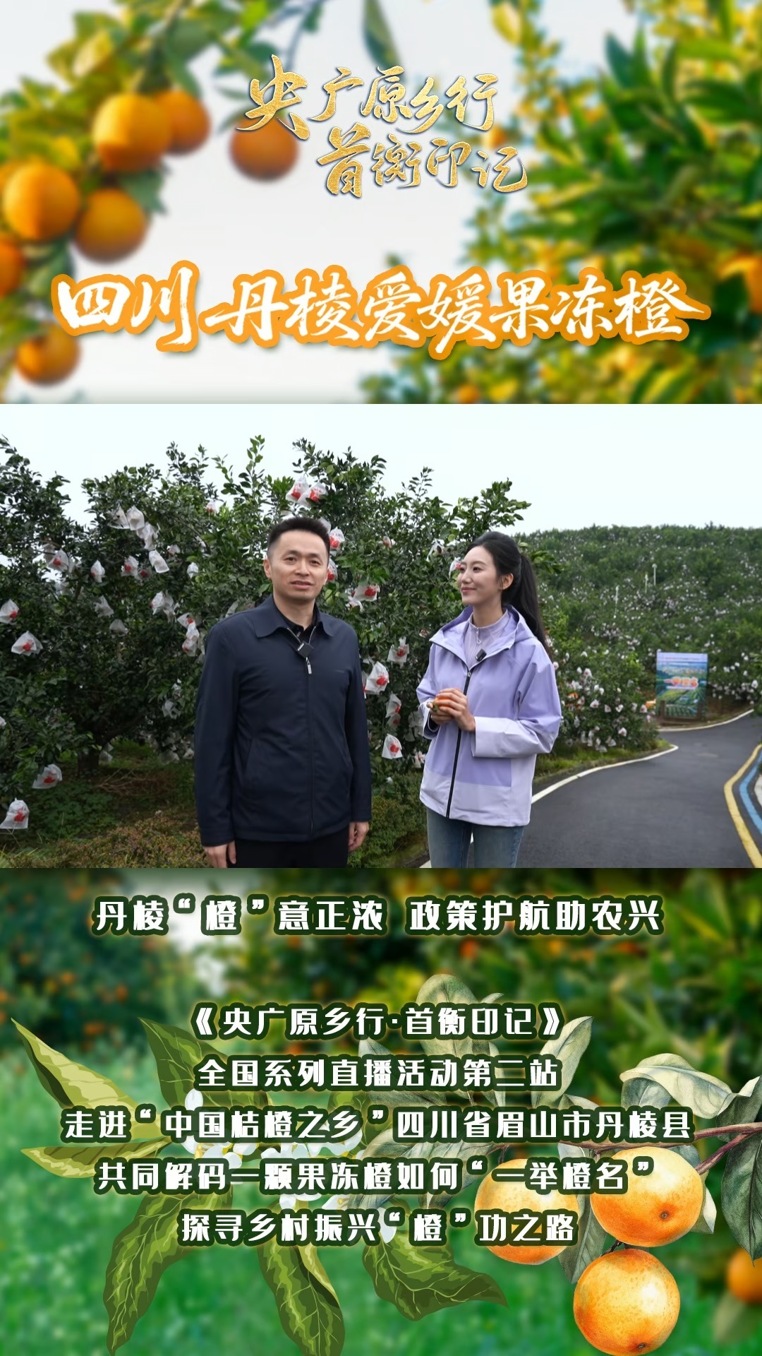 《央广原乡行·首衡印记》全国系列直播活动第二站走进“中国桔橙之乡”四川省眉山市丹棱县,共同解码一颗果冻橙如何“一举橙名”,成长为富民兴村的“黄金产业”,探寻乡村振兴“橙”功之路。