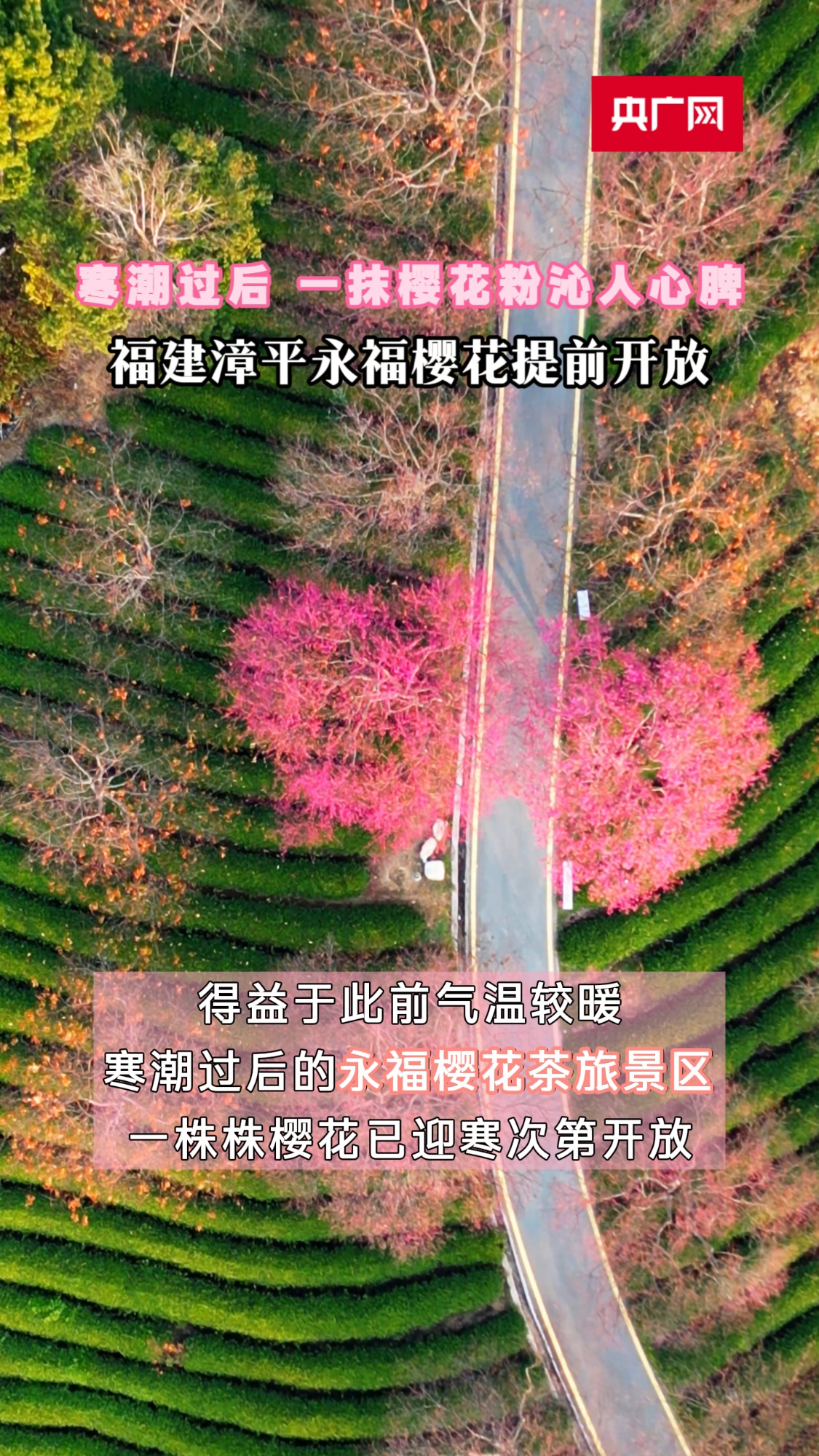 在福建漳平,得益于此前气温较暖,今年首场寒潮过后的永福樱花茶旅景区,一株株樱花已迎寒次第开放,除夕前即可赏樱“踏春”。