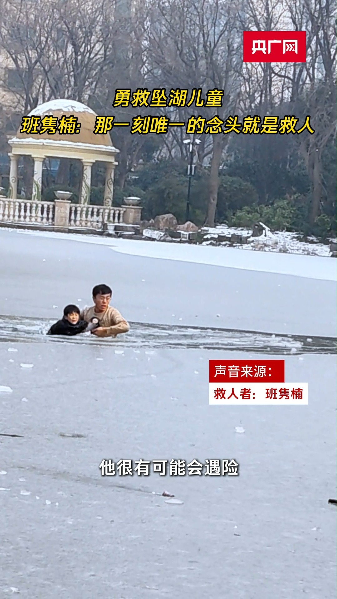 近日,河南洛阳市民班隽楠在带女儿玩耍时,目睹一名男孩坠入小区湖面冰窟,匍匐进入冰湖施救。