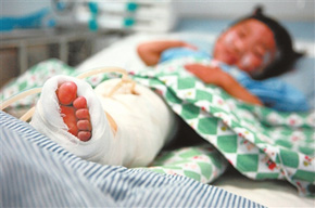 “刚送来时血钾高,随时会有生命危险” 7月24日晚20时,“7·23”重大交通事故最后一名获救者——2岁半的项炜伊被转院至温州医学院附属二院儿童医院治疗。当时,经初步诊断,“小伊伊”的左腿内侧有大片灼伤,外侧则有较为严重的损伤。左腿仅大拇指有反应,第2-5个脚趾呈苍灰色。 根据当时化验单,“小伊伊”的血钾很高,初步判断,这种血钾至少存在了3个小时,也就是说“小伊伊”随时可能因心脏骤停而会失去生命。另外,她的肾功能有损伤,是很明显的“挤压综合症”。