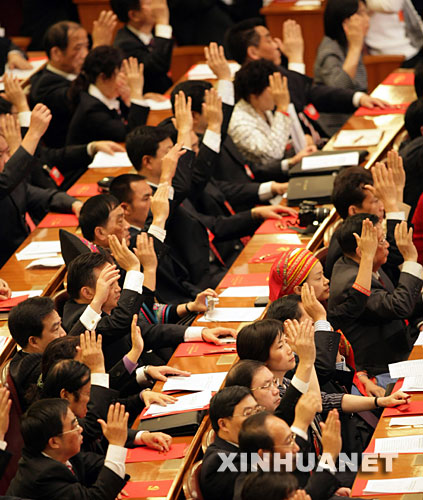 10月21日,中国共产党第十七次全国代表大会在北京人民大会堂胜利闭幕。这是代表们举手表决。 新华社记者 姚大伟 摄