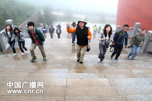记者们行走在满是雾气的六盘山上。