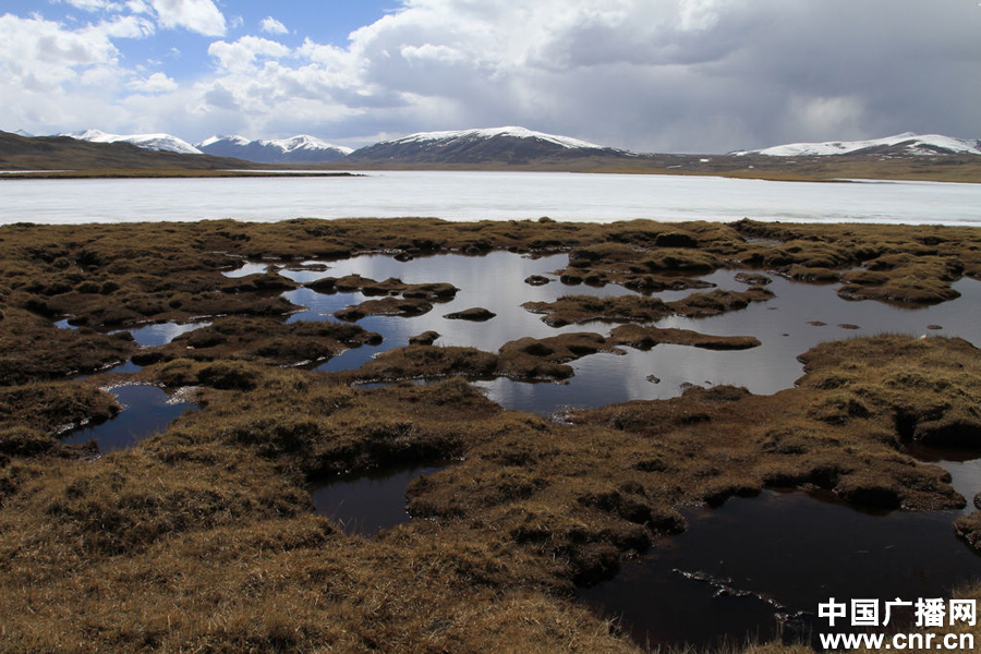 麦地卡地平均海拔5100米,远处的山峦常年积雪。这个时节,湖面上还结着薄冰。