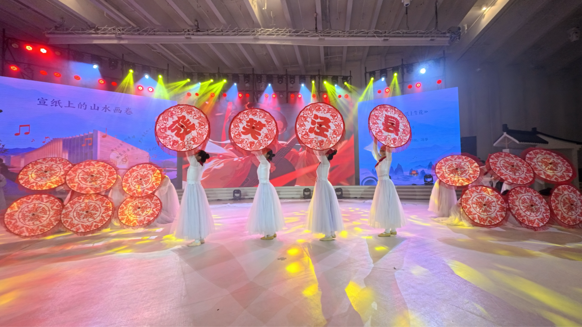 开幕式在创意序章《悦见泾川》中拉开帷幕。AIGC动态视频与非遗剪影表演交相辉映,生动勾勒出泾县山水灵秀与宣纸文化的千年传承脉络,瞬间将现场观众带入“诗画泾川”的意境之中。随后,舞蹈《纸上生花》以灵动舞姿演绎宣纸制作的匠心神韵,情景剧《诗潭情长》重现李白与汪伦的千古佳话,节目以艺术化表达串联起泾县的人文历史与时代新韵,赢得现场阵阵掌声。