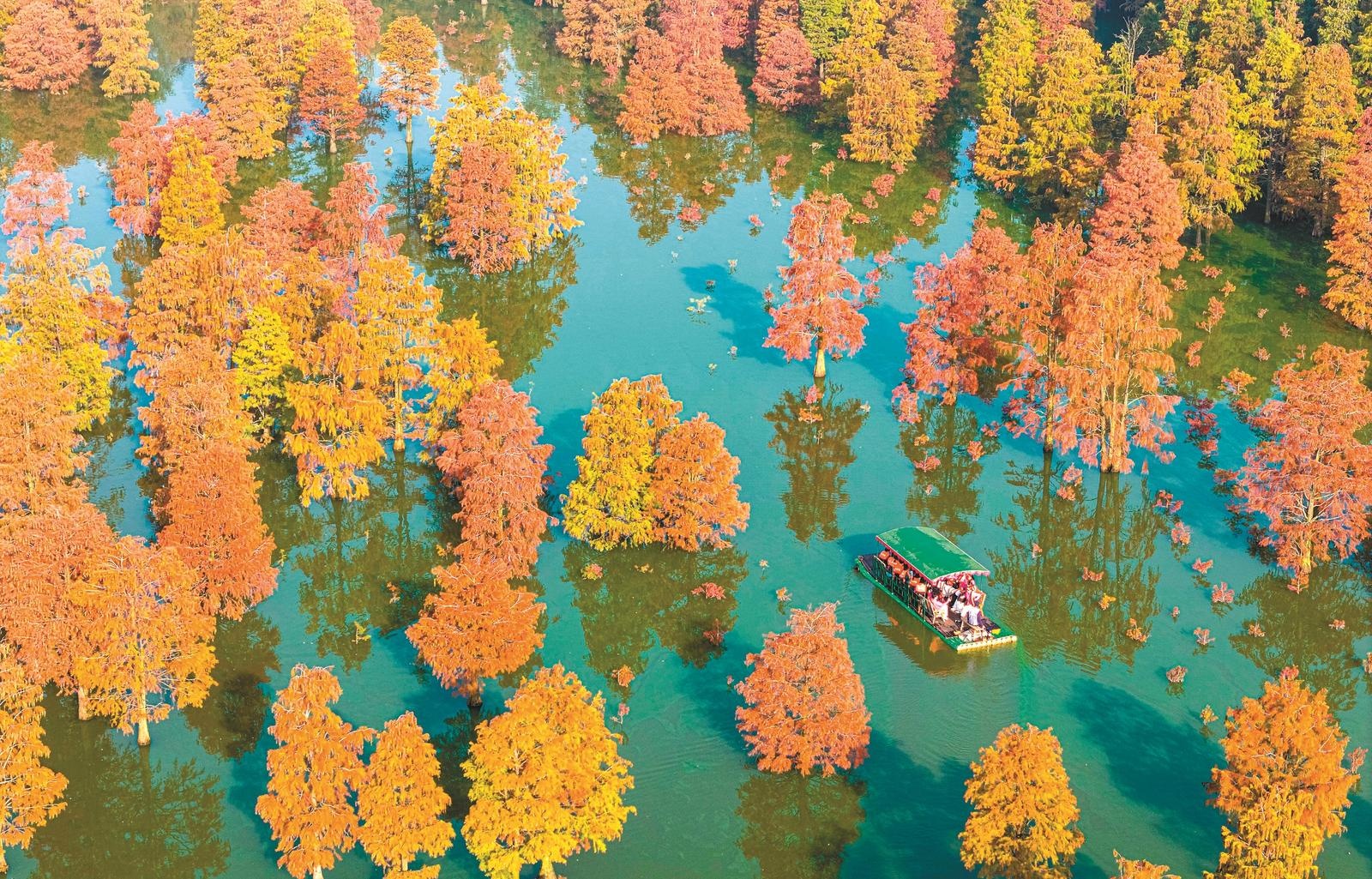11月15日,随着气温下降,庐江县柯坦镇千年大汉塘里的数千株池杉树树叶已经转黄变红,在初冬暖阳的映照下,勾勒出一幅自然和谐的生态画卷。