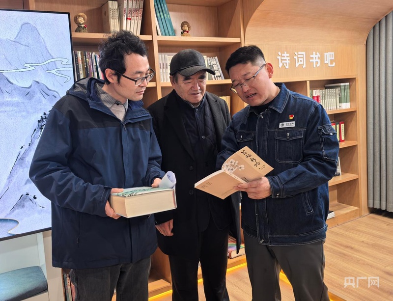 砀山县诗词学会会长邵经友(中)与学会成员讨论新一期会刊《芒砀新吟》。(央广网发 砀山县委宣传部 供图)