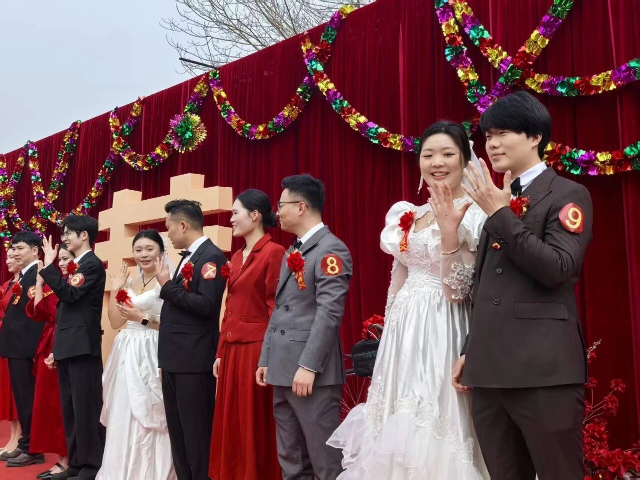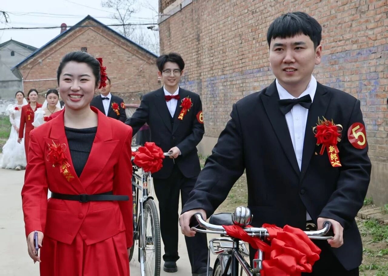 3月24日,亳州市谯城区古井镇药王村到处弥漫着喜庆气息。9对参加集体婚礼的新人脸上洋溢着幸福的笑容,在亲朋好友的簇拥下,推着“二八大杠”自行车步入婚礼现场。