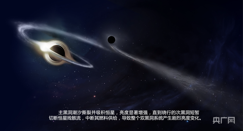 “这种现象预示着可能是一例发生在超大质量双黑洞系统中的潮汐撕裂恒星事件。”薛永泉解释,与普通的单黑洞潮汐撕裂恒星事件不同,当一颗恒星被主黑洞撕裂,恒星残骸流可能会被次黑洞干扰,导致无法正常回落到主黑洞,物质供给的中断导致光度骤然下降;当次黑洞远离后,恒星残骸流又能正常回落到主黑洞,于是主黑洞继续吸积残骸从而恢复光度。