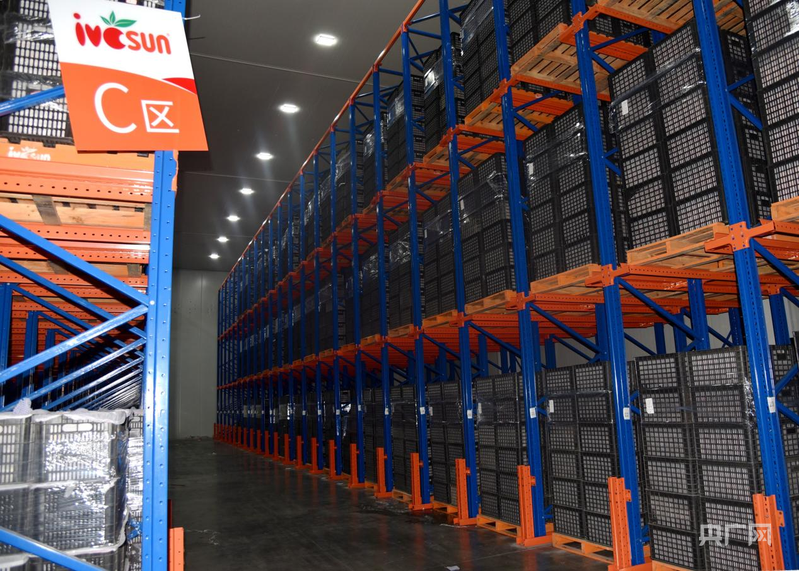 冷库里储存成箱的水果。(央广网发 李艳龙 摄)
