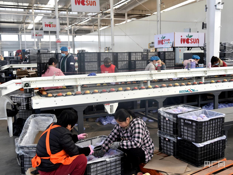 工人们忙着分拣、包装苹果。(央广网发 李艳龙 摄)