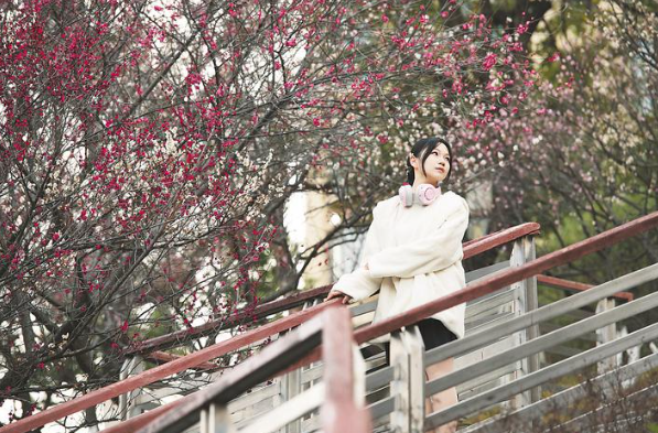 2月22日,合肥市匡河公园内梅花绽放,游人在公园里留影。