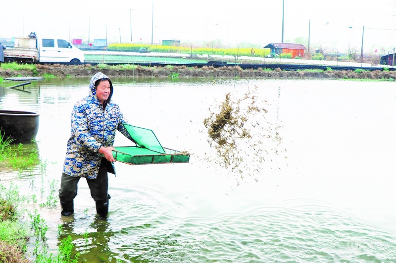 春日塘边,养殖户孙银昆站在浅水中,将一筐虾苗均匀地撒向养殖塘里(央广网发 宣州区委宣传部供图)