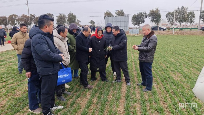 萧县农业部门邀请市农技专家朱德慧(右4)在杨楼镇新廷社区农田指导田间管理(央广网发 萧县供图)