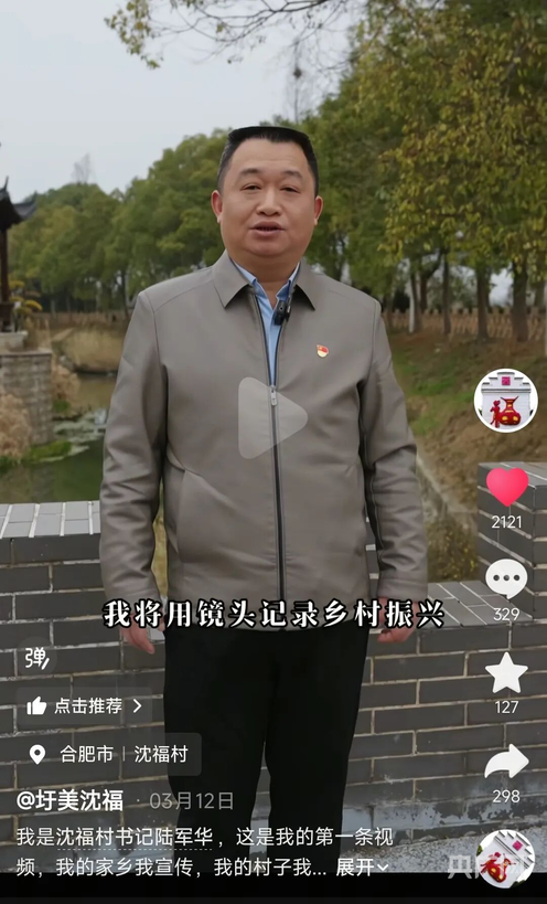 “大家好,今后我将用镜头记录乡村振兴,带大家看美景、品特产、讲好沈福故事……”近日,沈福村党总支书记陆军华成了小有名气的“网红书记”,他在沈福村的抖音账号“圩美沈福”上的一条出镜视频刚上线,浏览量就突破了10万,点赞量超过了2000。