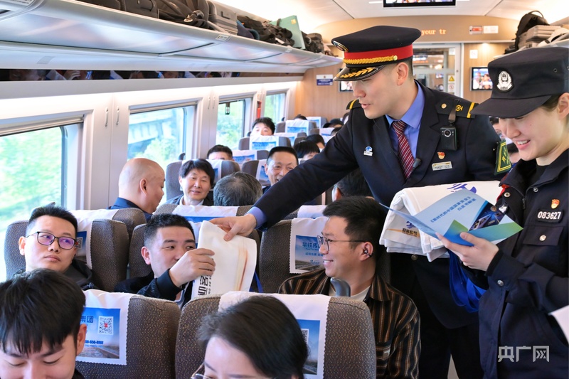 向旅客发放文创纪念品(央广网发 王鑫健 摄)
