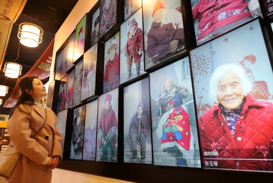 华祖庵景区内的“百岁老人墙”,48个方格展示了200多位百岁老人的生活肖像。这些照片由文旅工作人员实地走访拍摄,真实记录了老人们的精神面貌。讲解员张琦介绍,走访中发现百岁老人有着相似的养生习惯,可凝练为五个“得”:动得勤、吃得好、睡得香、养得勤、想得开。