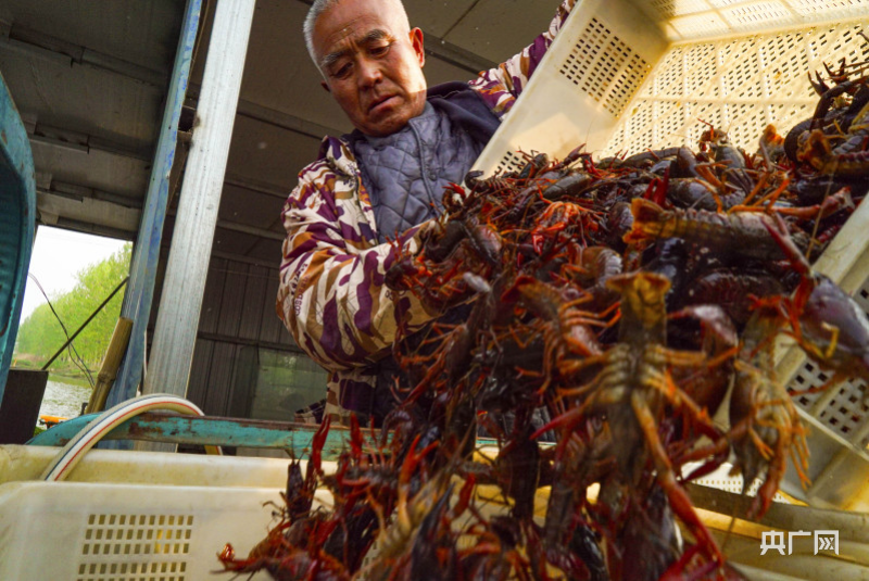 五河县沱湖乡大岗村虾稻共作产业基地里,村民收获小龙虾(央广网发 李向前 摄)