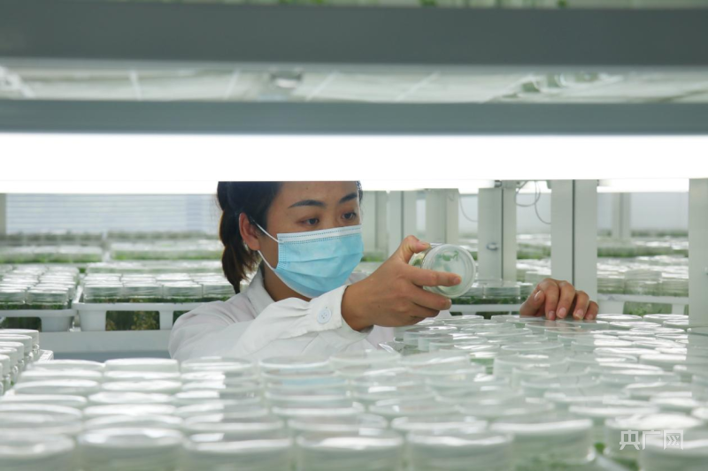 研究人员正在对组培瓶苗进行观察(央广网记者 徐鹏 摄)