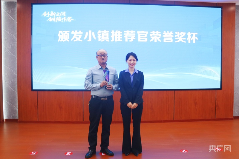 活动现场,央广网安徽频道总经理汪婷婷为东联镇居民陈宗斌授予“小镇推荐官”荣誉称号。2025年,《你好,小镇》首篇报道聚焦东联,以小镇推荐官陈宗斌为第一视角徐徐展开,展现了东联一路高质量发展,触达新高地路径上的动人故事。稿件发布后被全网置顶推荐,全网阅读量和热度值达到1.88亿。