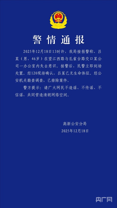 央广网合肥12月18日消息(记者 刘浩)18日晚间,合肥市公安局官方微信公众号“合肥警方”发布警情通报:当日13时许,合肥高新公安分局接报警称,吕某(男,46岁)在望江西路与孔雀台路交口某公司一办公室内失去意识。