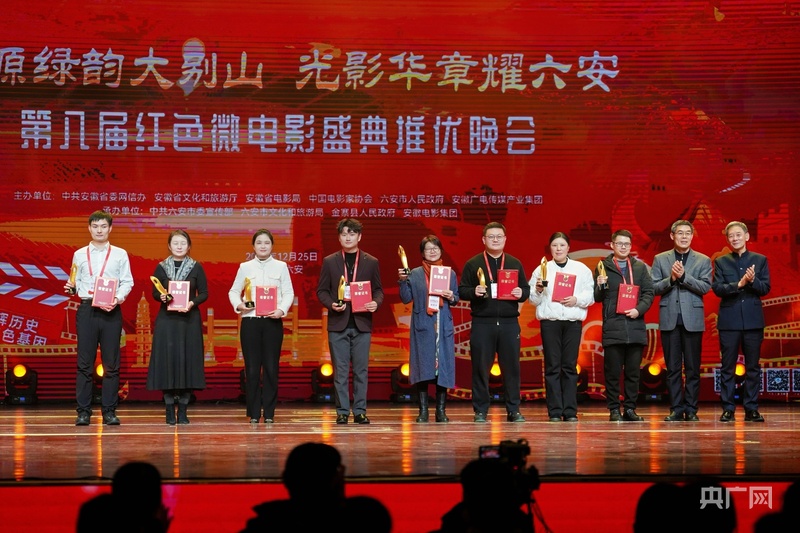 央广网六安12月26日消息(记者 徐秋韵)12月25日晚,第八届红色微电影盛典推优晚会在六安市金寨县中国红色微电影剧院举行。本次活动由中共安徽省委网信办、安徽省文化和旅游厅、安徽省电影局、中国电影家协会、六安市人民政府、安徽广电传媒产业集团共同主办,中共六安市委宣传部、六安市文化和旅游局、金寨县人民政府、安徽电影集团承办。晚会以”红源绿韵大别山 光影华章耀六安”为主题,汇聚全国影视创作者、行业专家、媒体代表及各界观众近600人,共同见证红色光影的荣耀时刻。
