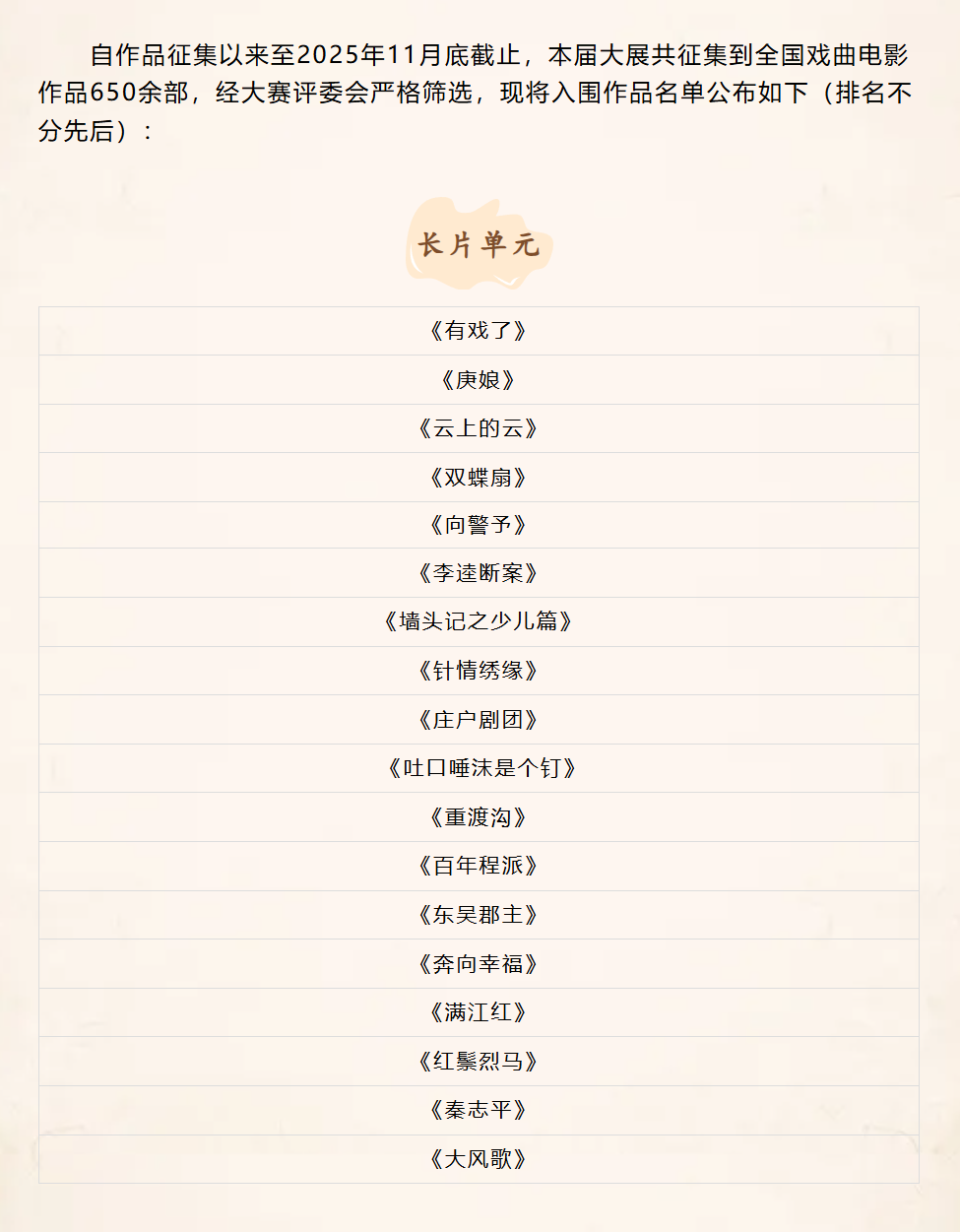 据了解,本届大展的征评工作呈现出以下几大特色:一是征集范围广、参与力量多元,既有中国国家京剧院、中国戏曲学院等国家级艺术单位,也有各省市戏曲院团、影视企业与高校踊跃投稿,形成专业与民间共同推进的创作格局;二是作品类型丰富,涵盖戏曲电影长片、短片及短视频。征集剧目剧种丰富、形式多样,涵盖京剧、越剧、闽剧、沪剧、扬剧、黄梅戏、婺剧、动画戏曲、楚剧、豫剧、川剧、粤剧、莆仙戏、潮剧等众多艺术门类;三是评审机制科学严谨,采用初评打分与终评会议相结合的方式,兼顾艺术品质与行业导向。四是注重戏曲电影的当代传播,设立年度导演、编剧、摄影、美术、剪辑等荣誉,鼓励戏曲电影在创作各环节的精品化与专业化发展。