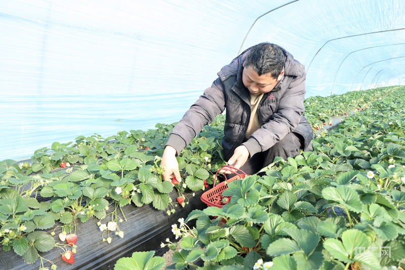 种植户宋磊磊正在棚内熟练地采收草莓。他来自安徽省淮南市,在庆丰村承包了20余亩地,至今已有十年草莓种植经验。“我们种的主要是‘红颜’和‘奶油’两个品种,味道好,很受欢迎。”他介绍,通过错峰种植,草莓的采摘期可以从每年12月持续到次年4月,眼下正值销售旺季,草莓每斤能卖到30元左右。