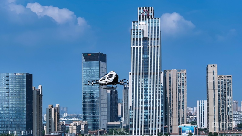 合翼航空运营的EH216S无人驾驶载人航空器在合肥上空飞行(央广网发 包河区委宣传部供图)