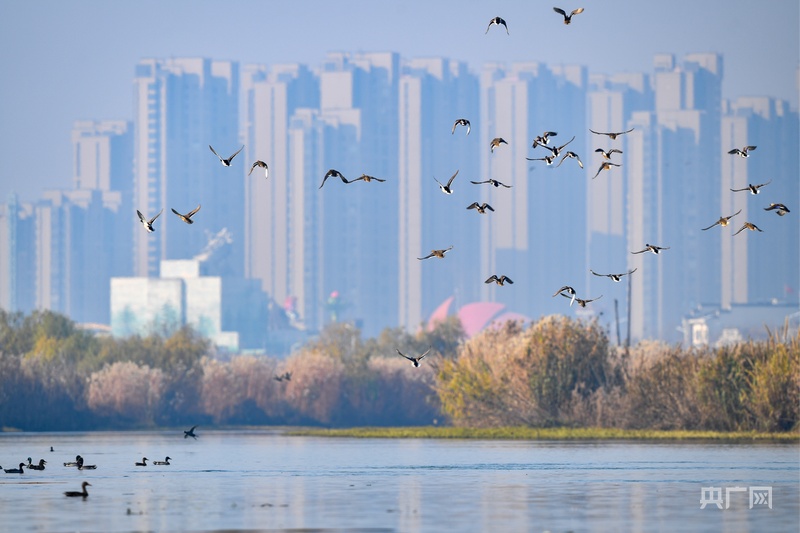 合肥巢湖北岸的湖滨国家湿地公园成群结队的候鸟在湿地翱翔(央广网发 刘玉才摄)