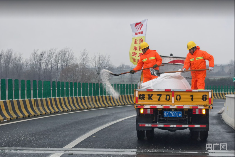 1月19日,S25徐淮阜高速阜阳中心苏阜园区保畅分中心养护人员对重点路段人工撒布融雪剂(央广网发 皖通公司供图)