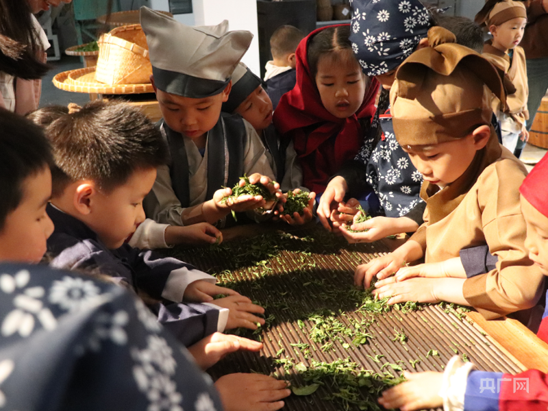 小学生身着古装在黄山市徽州区一茶厂体验制茶(央广网发 黄山市徽州区宣传部供图)