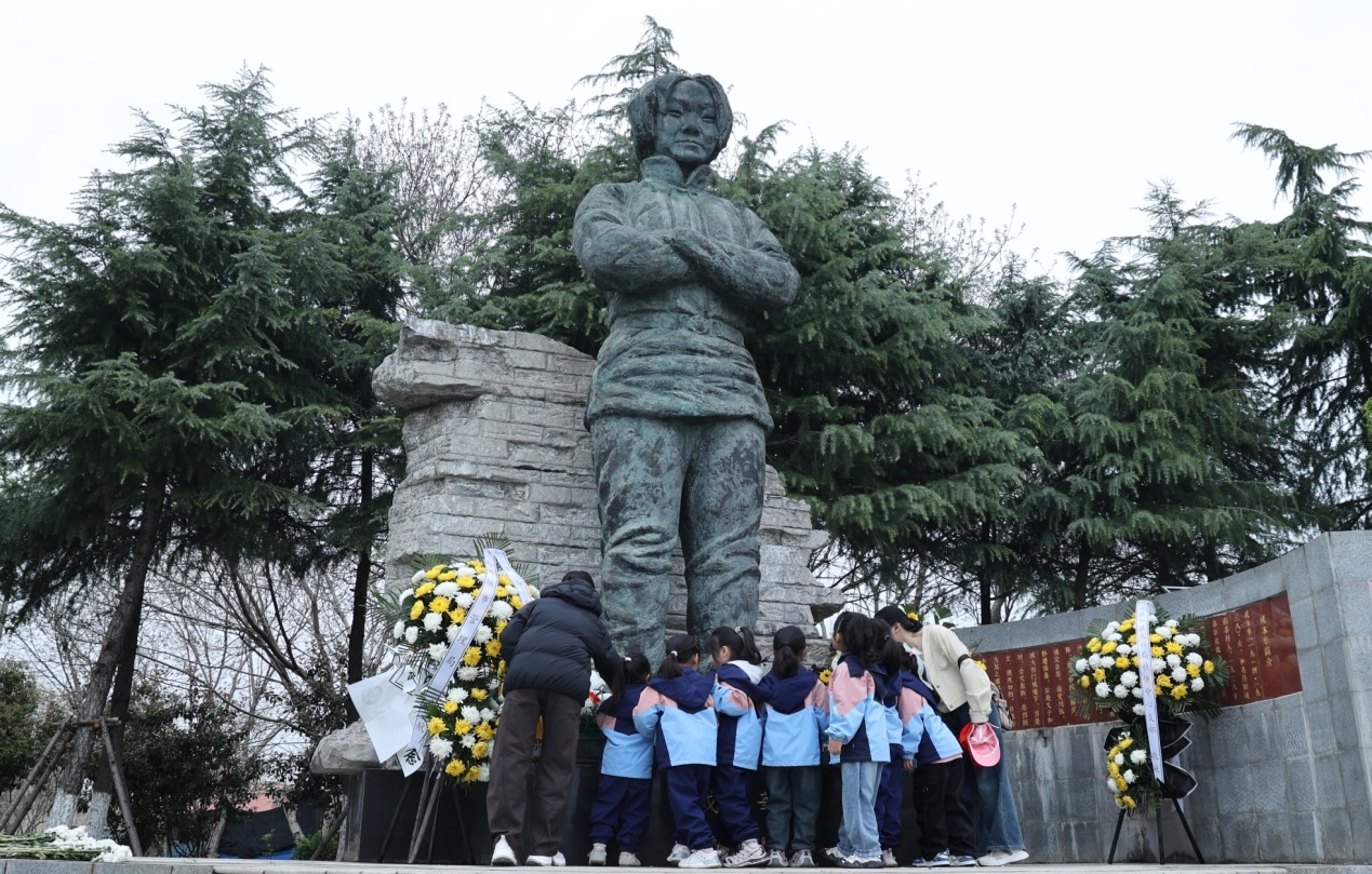 孩子们在老师、家长的陪伴下,肃立在成本华烈士雕像前,缅怀革命先烈。(央广网发 马鞍山师专附属幼儿园供图)