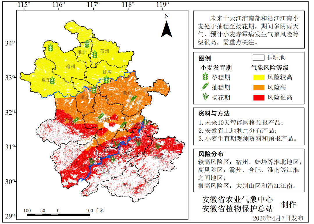 安徽省植物保护总站与省农业气象中心已于4月7日联合发布风险预警:未来10日大别山区、沿江江南小麦赤霉病发生气象风险等级为“风险很高”,江淮之间为“风险高”,淮北地区也达“风险较高”,防控形势紧迫。