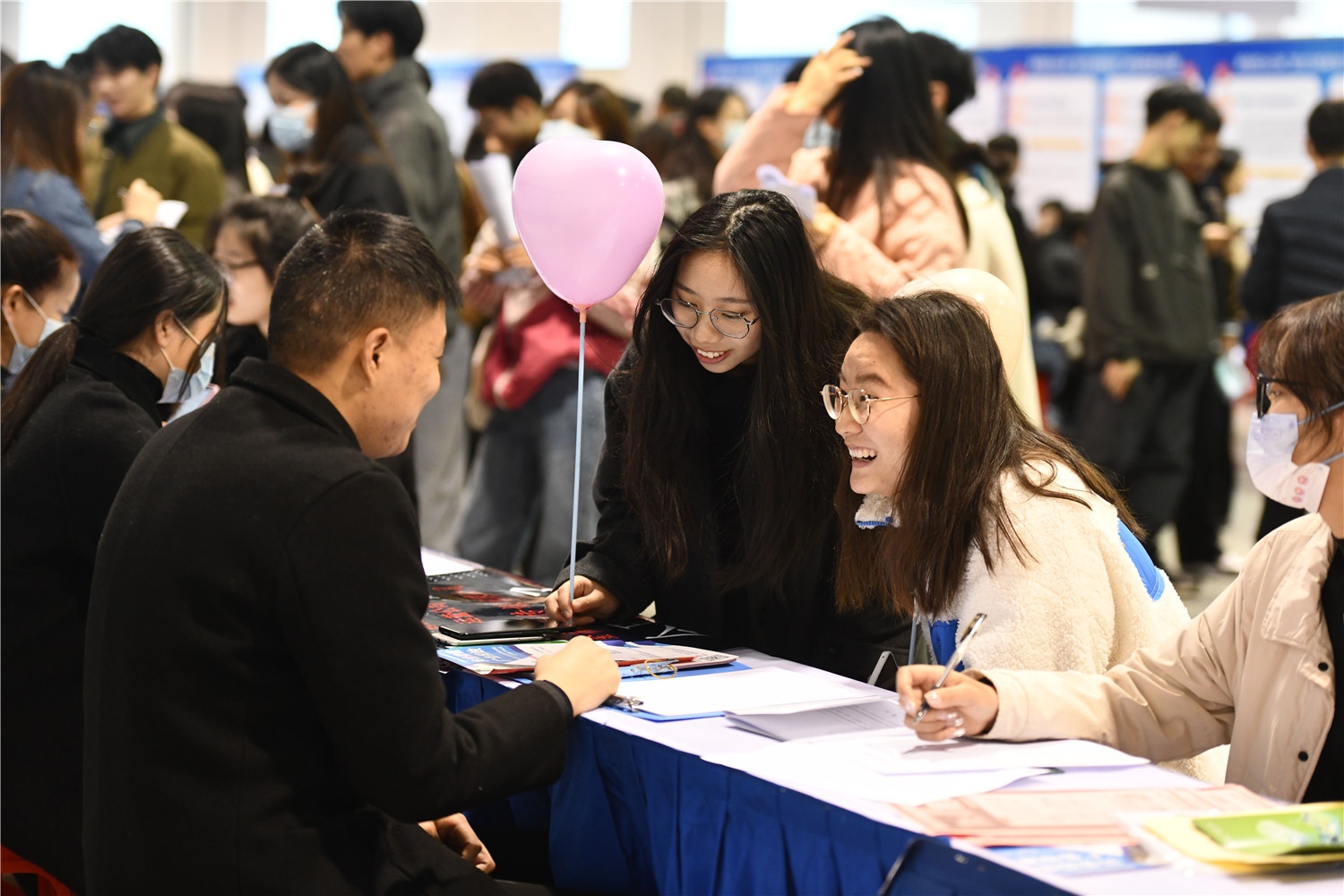12月8日,大学生在阜阳高校就业招聘会现场与用人单位交流。当日,阜阳市2023年“招才引智高校行”本地高校联合招聘活动在阜阳师范大学举办,300多家用人单位带来5000多个就业岗位。