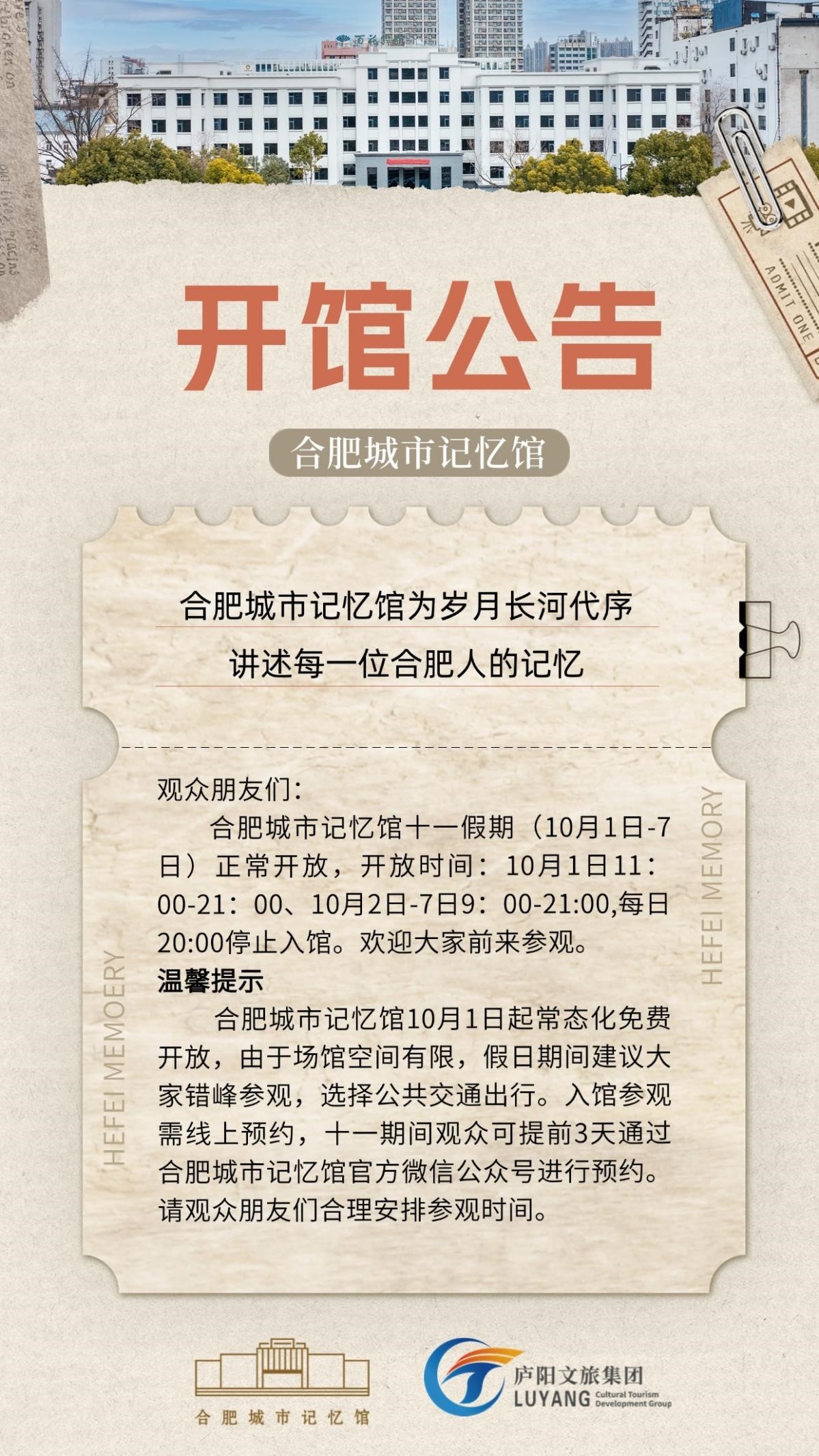 据悉,该场馆于9月23日-28日进行压力测试,10月1日正式开馆。游客可提前3天通过“合肥城市记忆馆”官方微信公众号在线预约,凭预约码免费入馆参观。