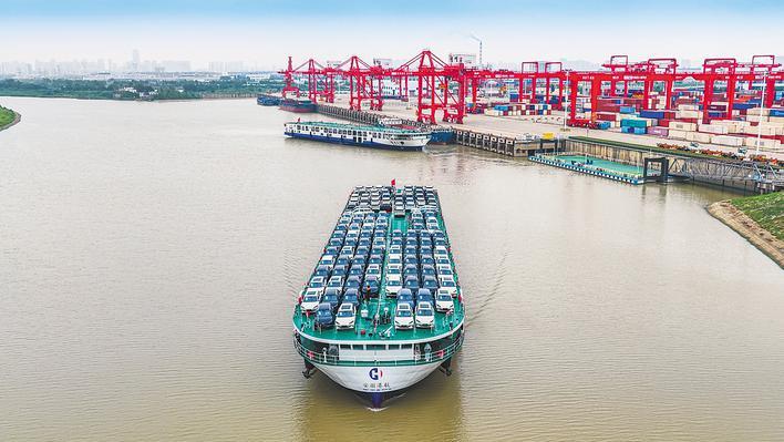2025年9月9日,满载新能源汽车的货船,从合肥港启航,借水运之力奔赴上海,再由此远销海外。(郭亚 摄)