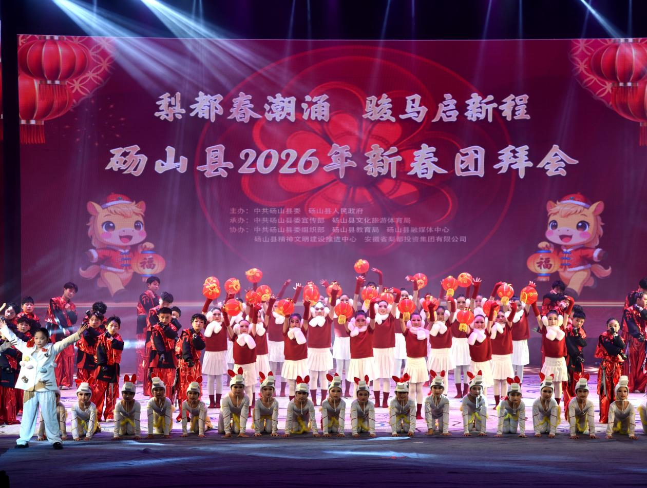 央广网合肥2月12日消息(记者徐鹏 通讯员李艳龙)2月11日下午,砀山县市民广场会议中心内灯光璀璨、暖意融融,“梨都春潮涌·骏马启新程”砀山县2026年新春团拜会文艺演出在此举行。
