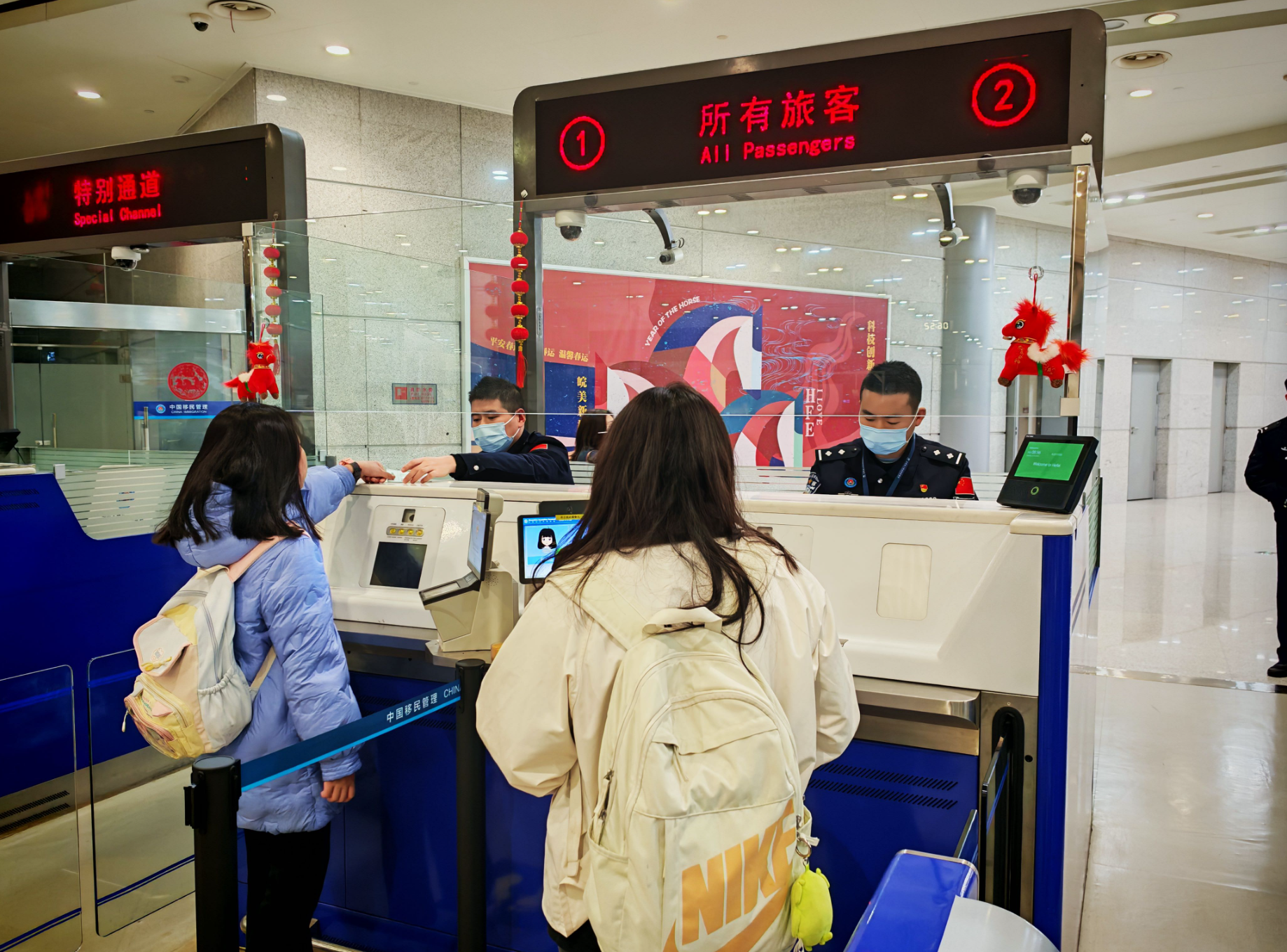 “Welcome to China!”“欢迎回家,请出示您的证件。”当旅客进入入境候检大厅,边检民警们也开始了除夕当日第一班前台验放工作,引导旅客有序排队、办理入境手续、方寸之间章起章落,藏蓝色的身影在熙熙攘攘的人群中格外明亮。“春节期间客流量较平日增加很多,但对于我们来说,节日意味着更细致的查验和更周全的保障。”该站执勤一队民警岳冶说道。