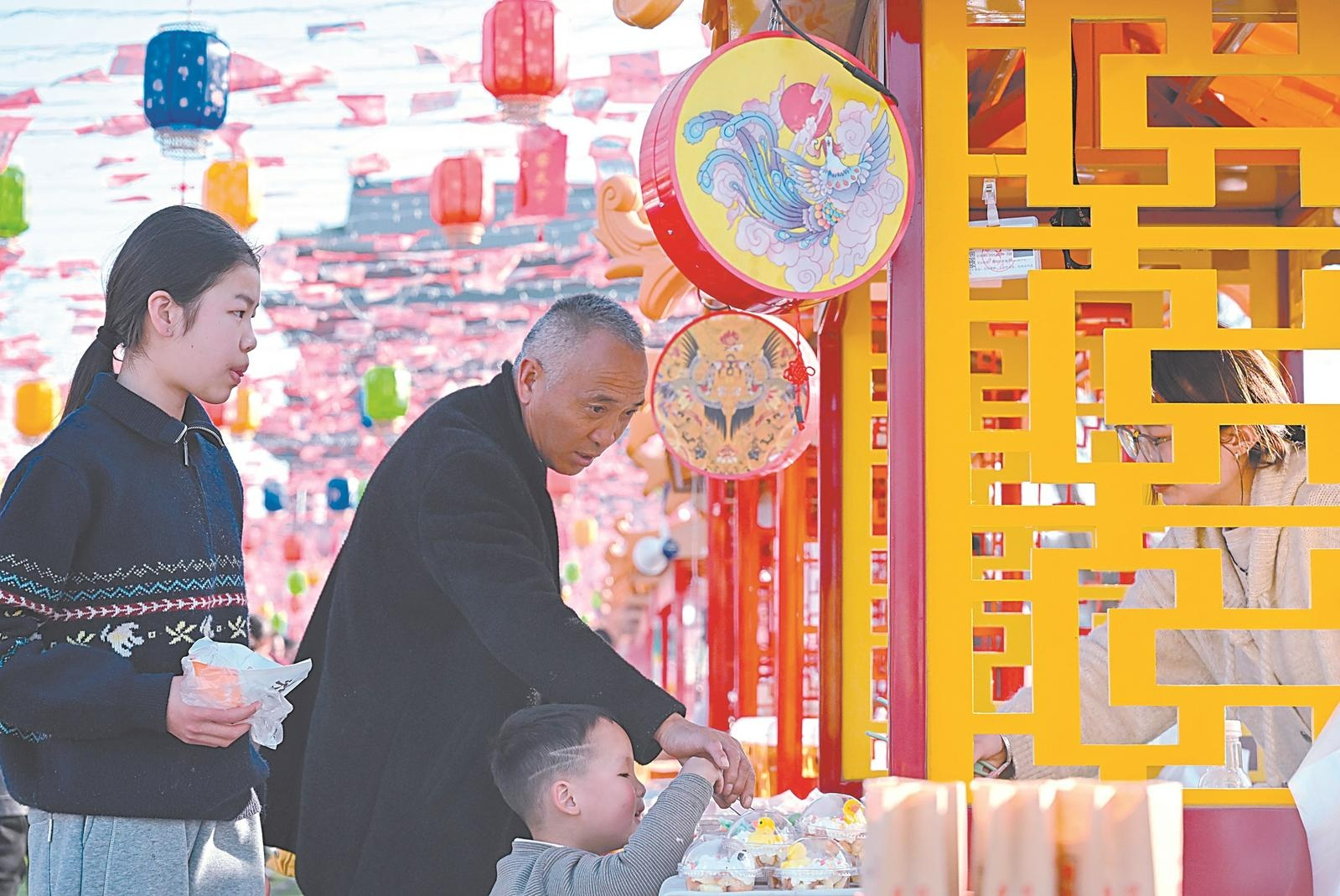 2月21日,游客在凤阳县洪武门广场洪武市集购买美食。记者徐旻昊摄