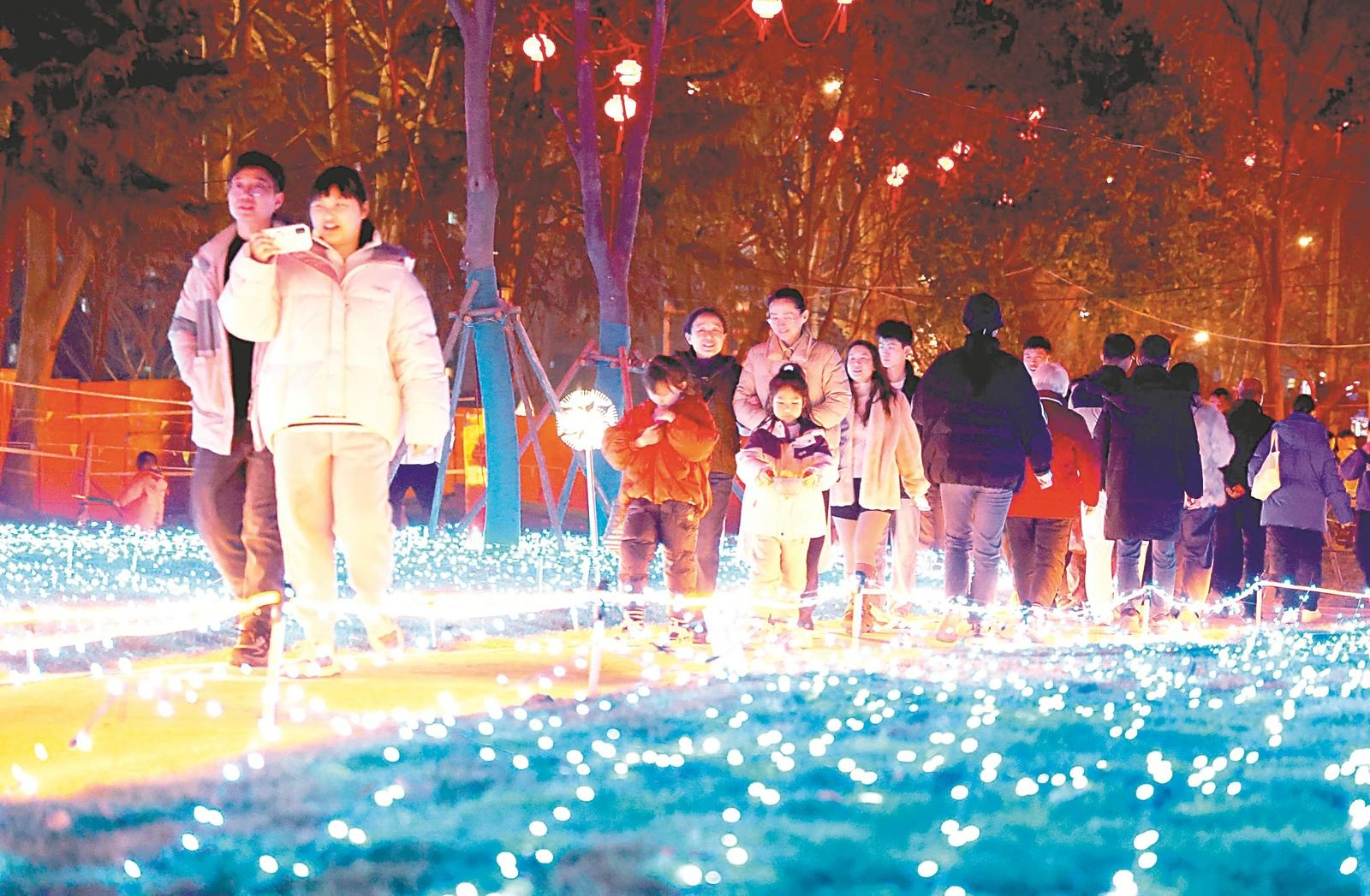 2月19日晚,游客在濉溪县乾隆湖景区新春灯会上游玩赏灯。通讯员周方玲摄