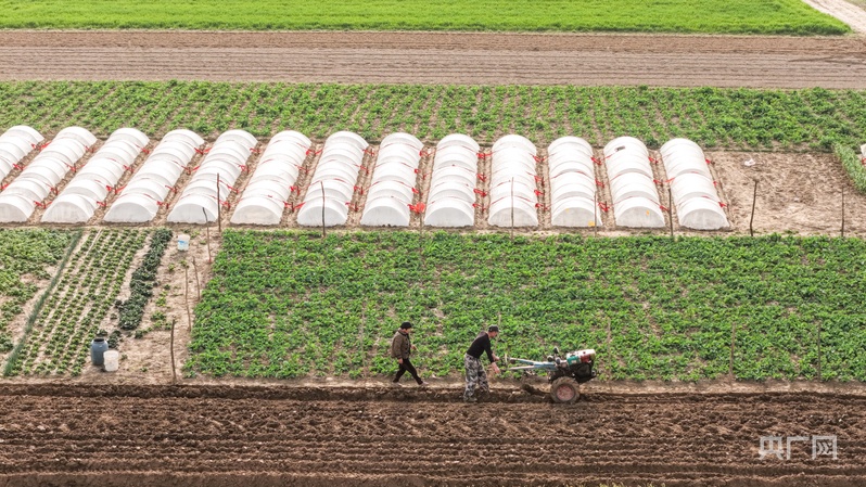 种植户正利用耕机在整地,准备播种早春蔬菜(央广网发 李向前摄 无人机照片)