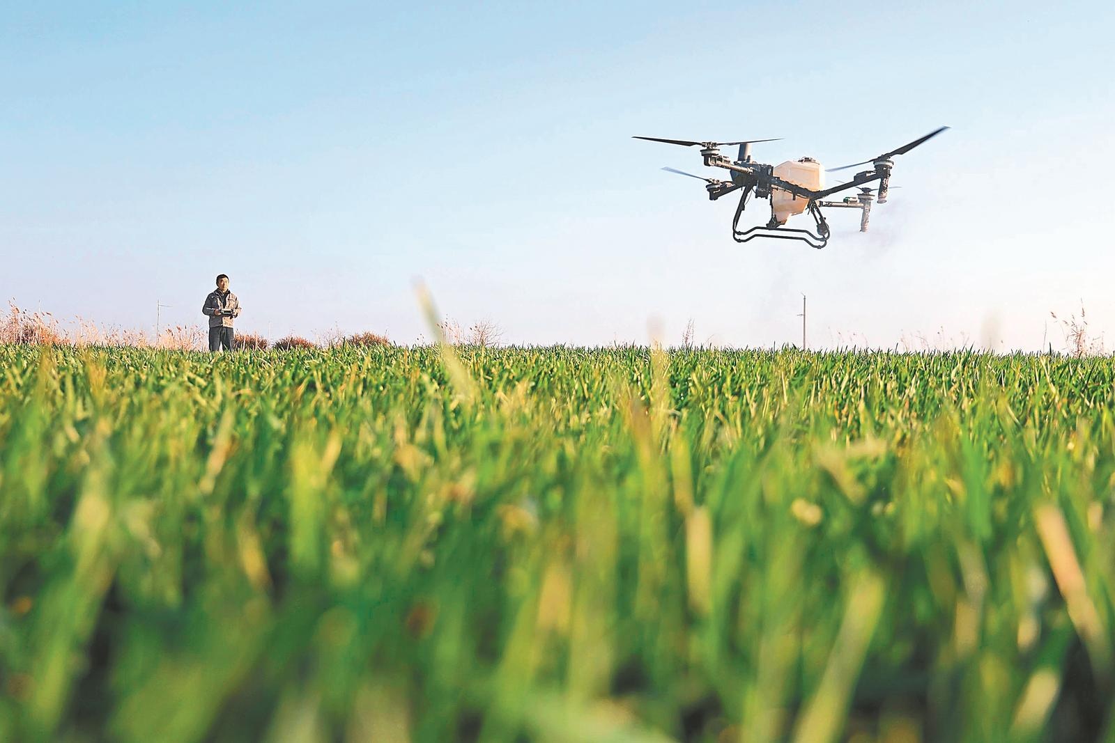2月22日,宿松县复兴镇的麦田里,安徽农垦华阳河农场组织开展小麦无人机田管作业。通讯员李龙摄