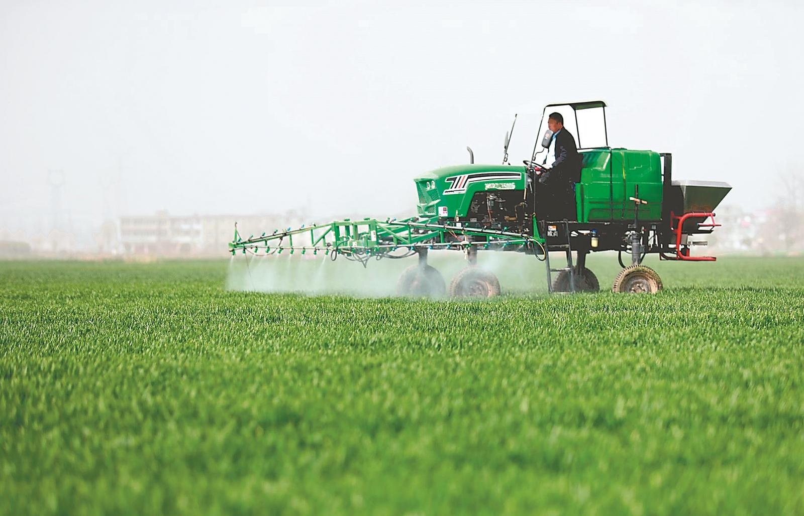 2月22日,在阜阳市颍东区新华街道浩丰种植专业合作社,农民驾驶自走式高杆喷雾机对小麦进行喷药作业。通讯员宿飞摄