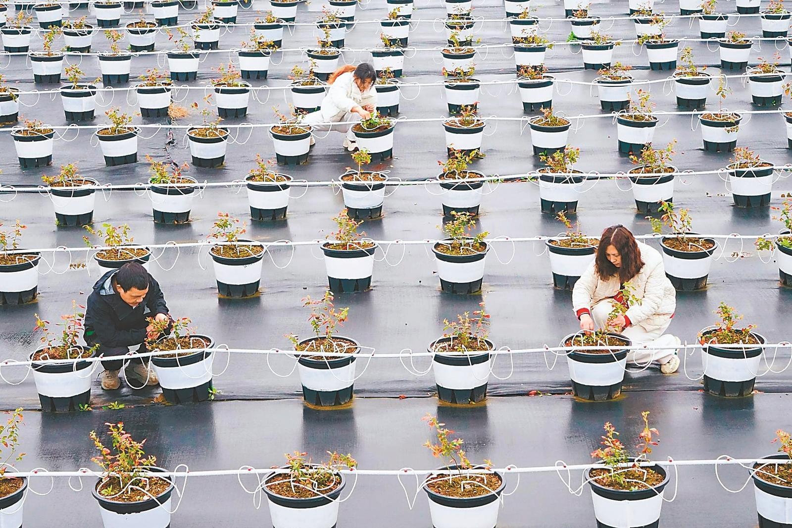 2月25日,怀宁县平山镇石牛村基质蓝莓基地,村民在管护蓝莓苗。通讯员 檀志扬 刘宇骏 摄