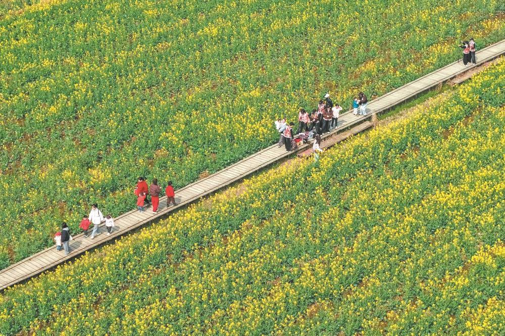 3月7日,铜陵市铜官区西湖镇横塘乡村生态园里的油菜花争相绽放,市民和游客在金黄的花田里踏青赏花,感受大好春光。通讯员储著传摄