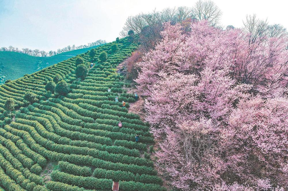 3月8日,芜湖市繁昌区孙村镇水口村茶园樱花绽放,粉色的花朵与绿色的茶垄相映成景,吸引游客前来打卡游玩。通讯员邢朝明摄