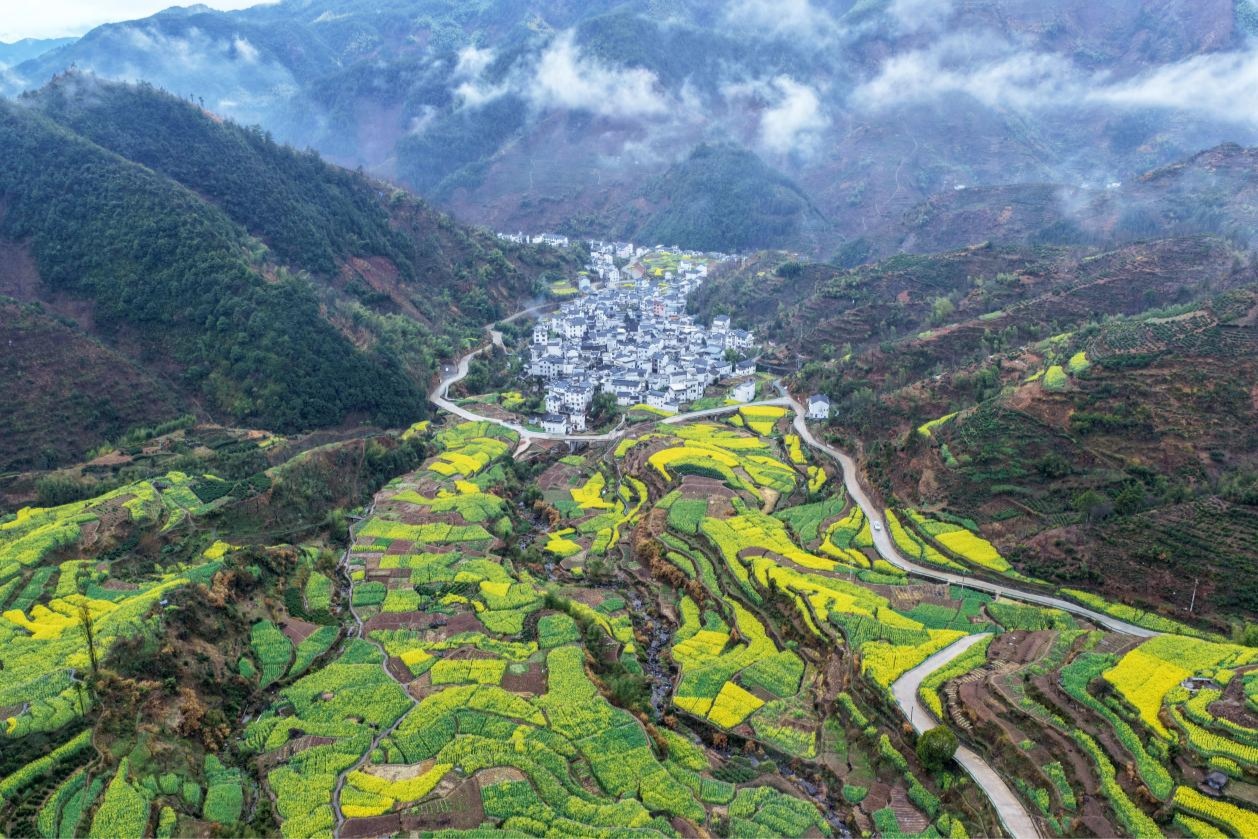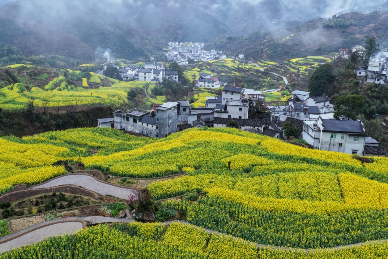 连日来,安徽省黄山市歙县三阳镇上坦自然村,千亩高山梯田油菜花竞相绽放,金黄的油菜花层层叠叠,与古朴村落、远山云雾相互交融,构成一幅幅美不胜收的乡村春日画卷。(记者 潘祯祥)