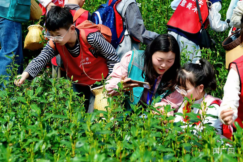 参加采茶体验的研学师生(央广网实习记者 关家燊摄)